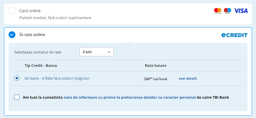 Odata ajunsi la metoda de plata, alegeti butonul „In rate online” si la optiune puneti „TBI Bank – 4 Rate fara costuri Asigurari” dupa care dati pe „Pasul urmator” si gata, completezi si semnezi online contractul de credit.  (mai jos am lasat si o poza, sub buton).